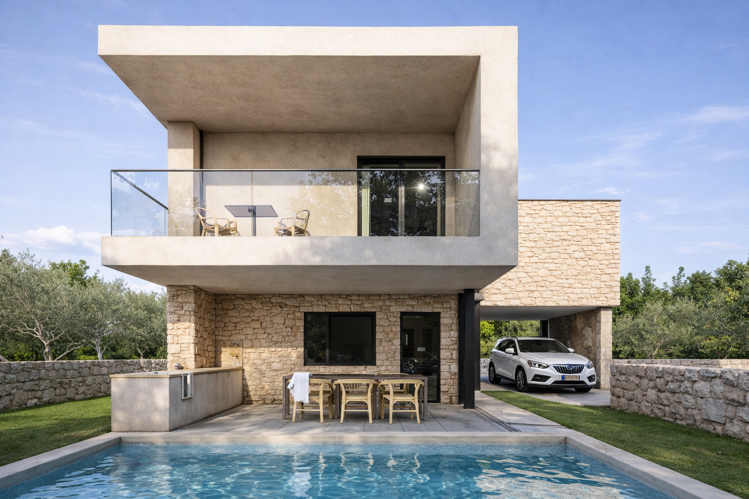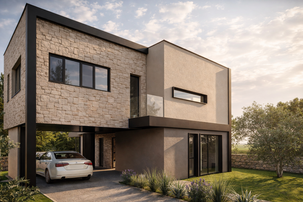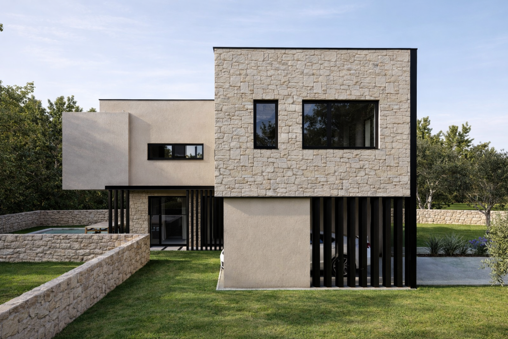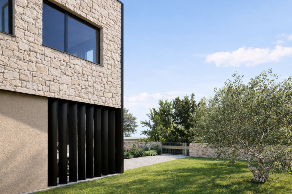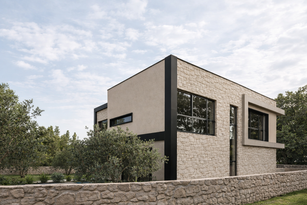 Die Materialität ist reduziert und umsetzbar – eine Kombination aus hellem Putz und Steinverkleidung verleiht dem Haus einen dem mediterranen Kontext angemessenen Charakter, während dunkle Akzente in Rahmen und Details das Volumen zusätzlich definieren.
