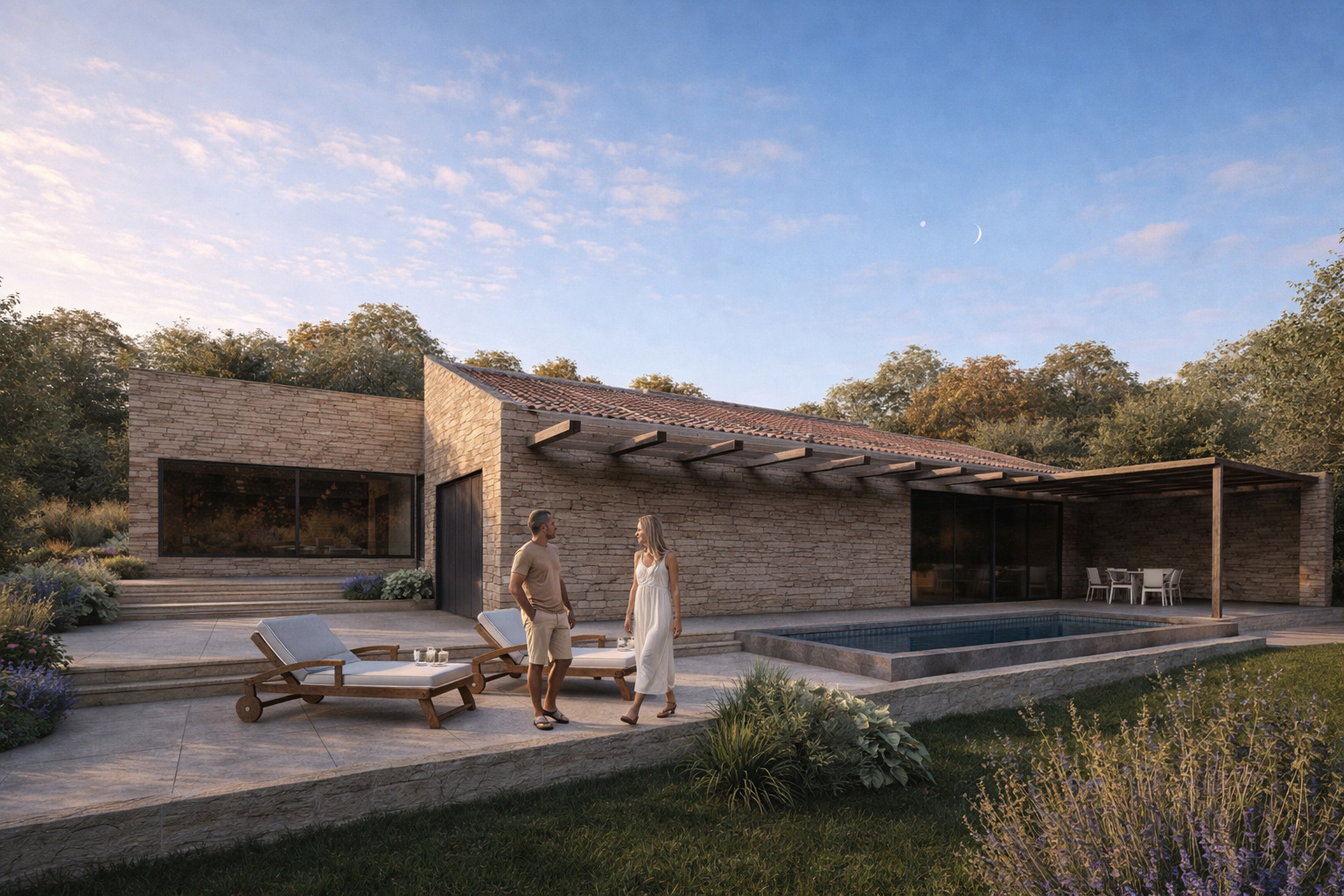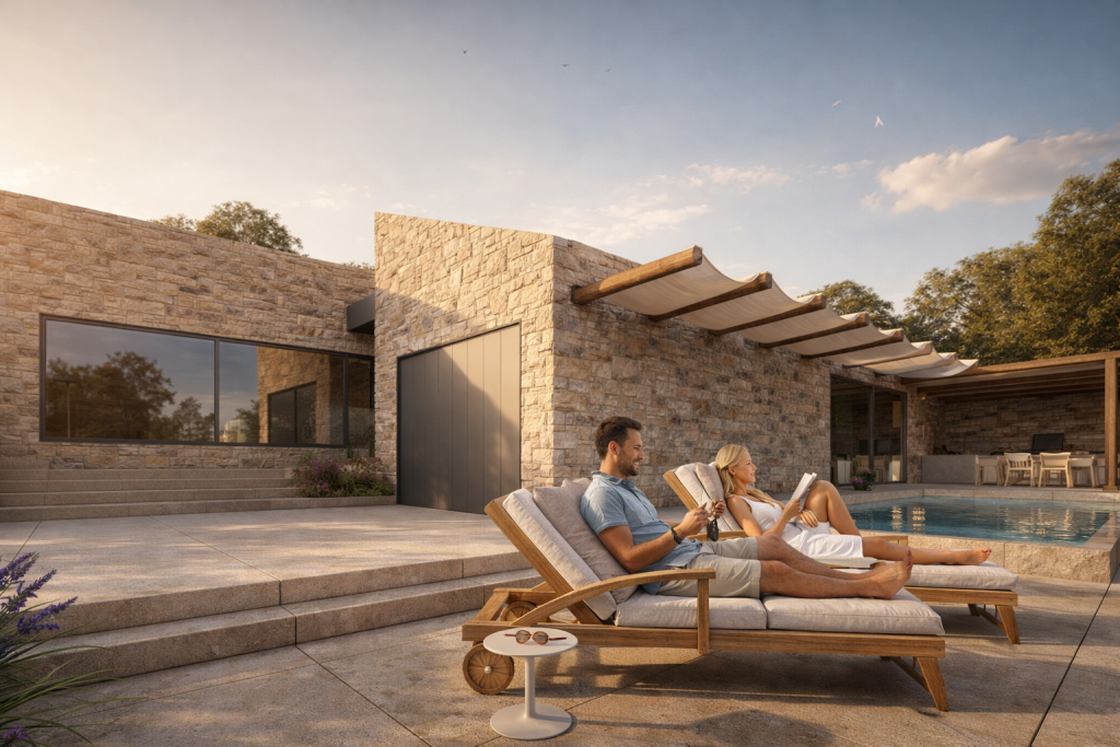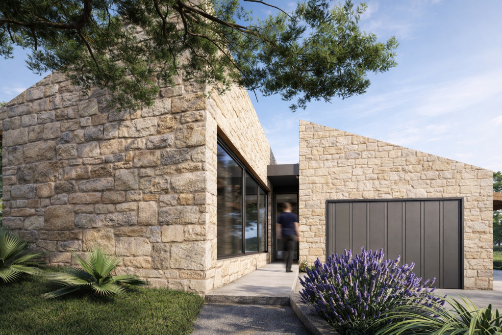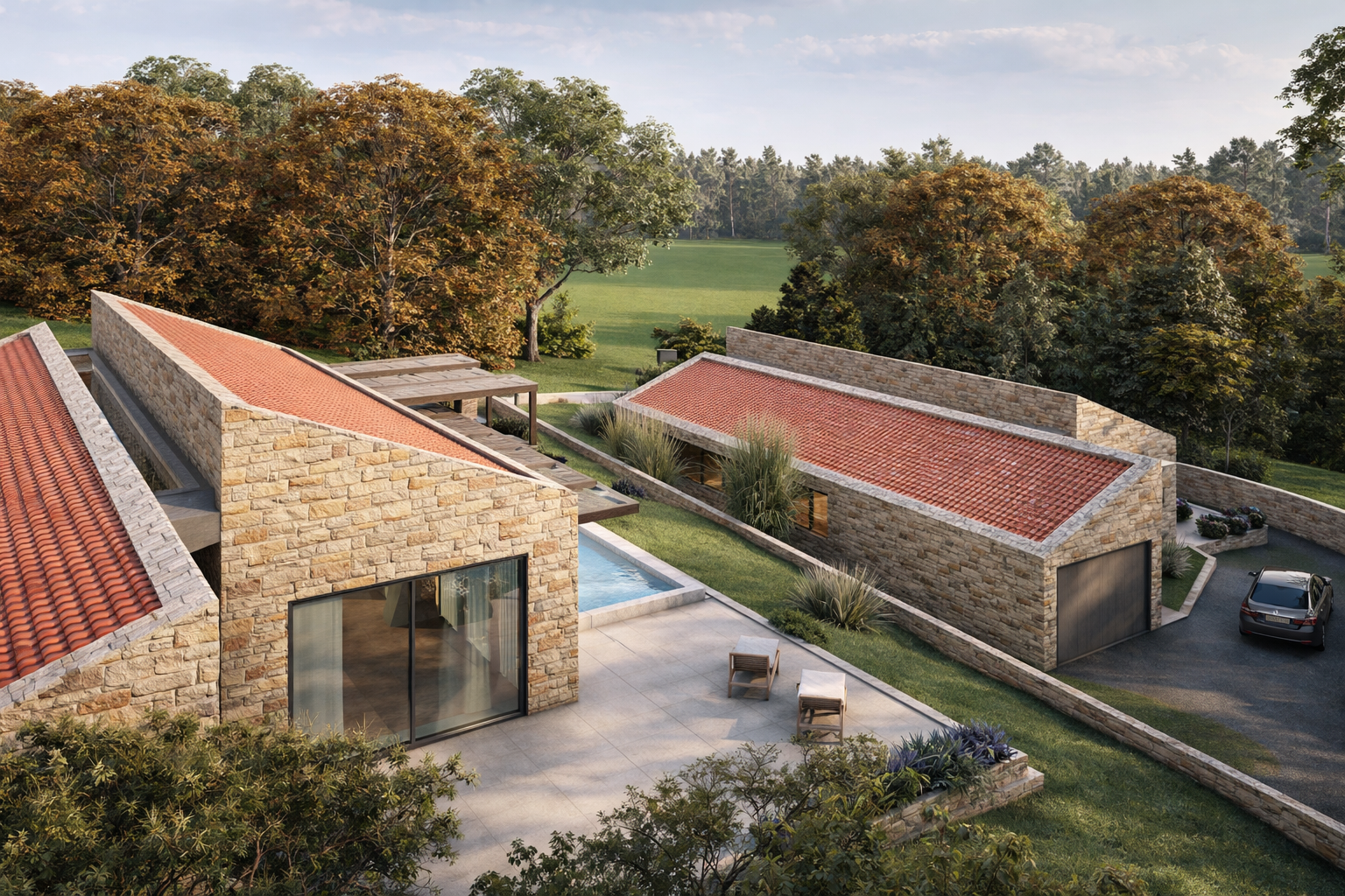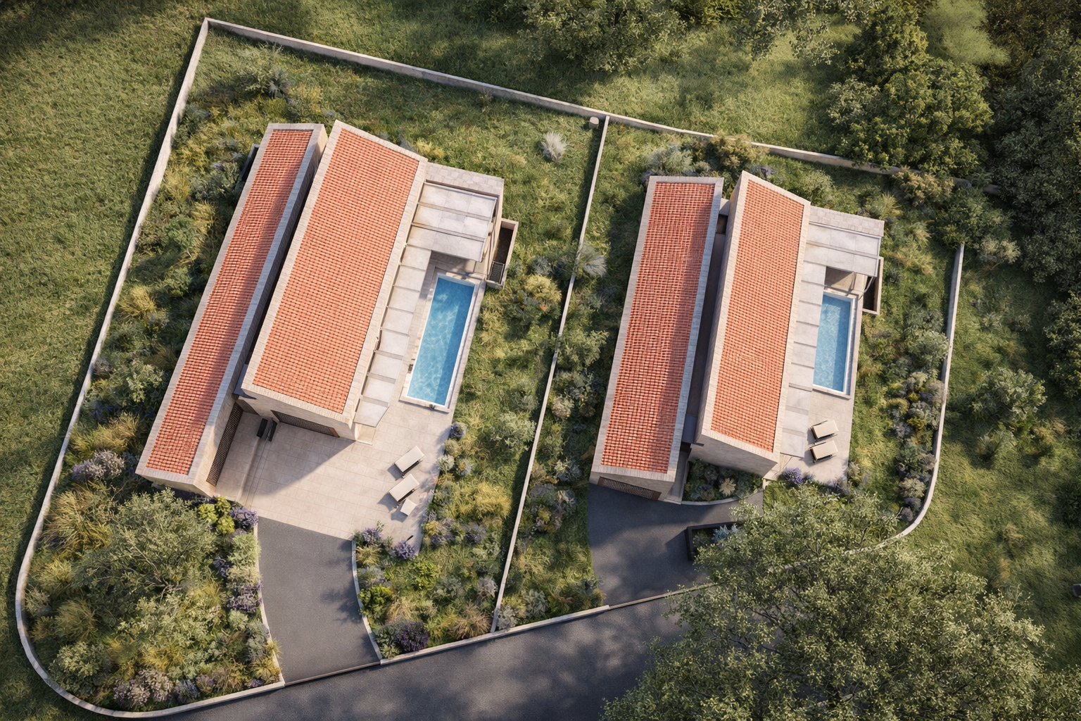 Die Investoren, die ursprünglich aus Österreich stammen, suchten nach dem perfekten Gleichgewicht zwischen Luxus und Einfachheit, das ein Gefühl von Zuhause vermittelt und gleichzeitig Raum für Entspannung und Naturgenuss bietet. Unsere Mission war es, ihre Vision zu verwirklichen und eine einzigartige Mischung aus traditioneller und zeitgenössischer Architektur zu schaffen. Die Steinfassade verbindet die Häuser mit dem lokalen Erbe, während große Glasflächen und das Flachdach als moderne Verbindung zwischen den beiden Einheiten ununterbrochenen visuellen Kontakt mit dem Außenbereich ermöglichen und ein Gefühl von Freiheit und Offenheit schaffen.