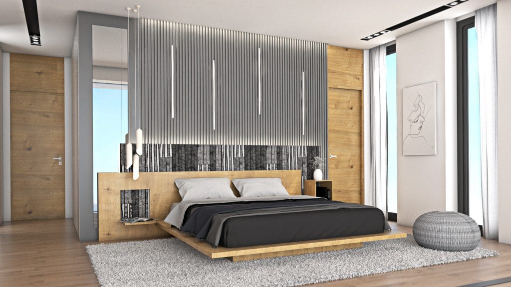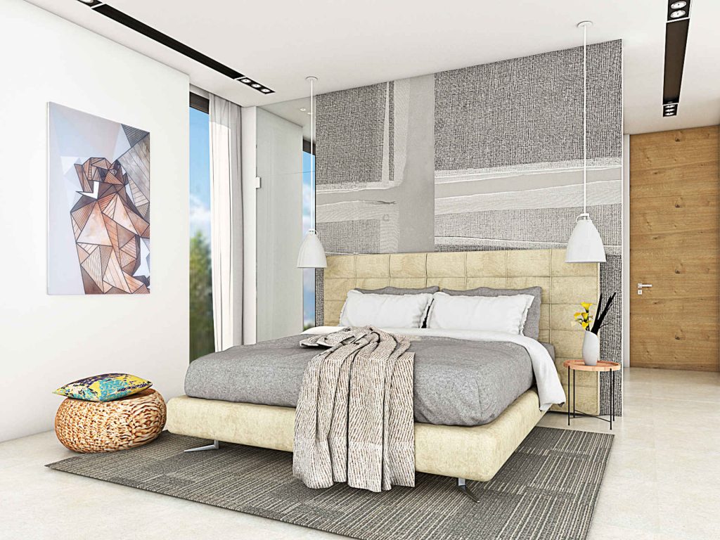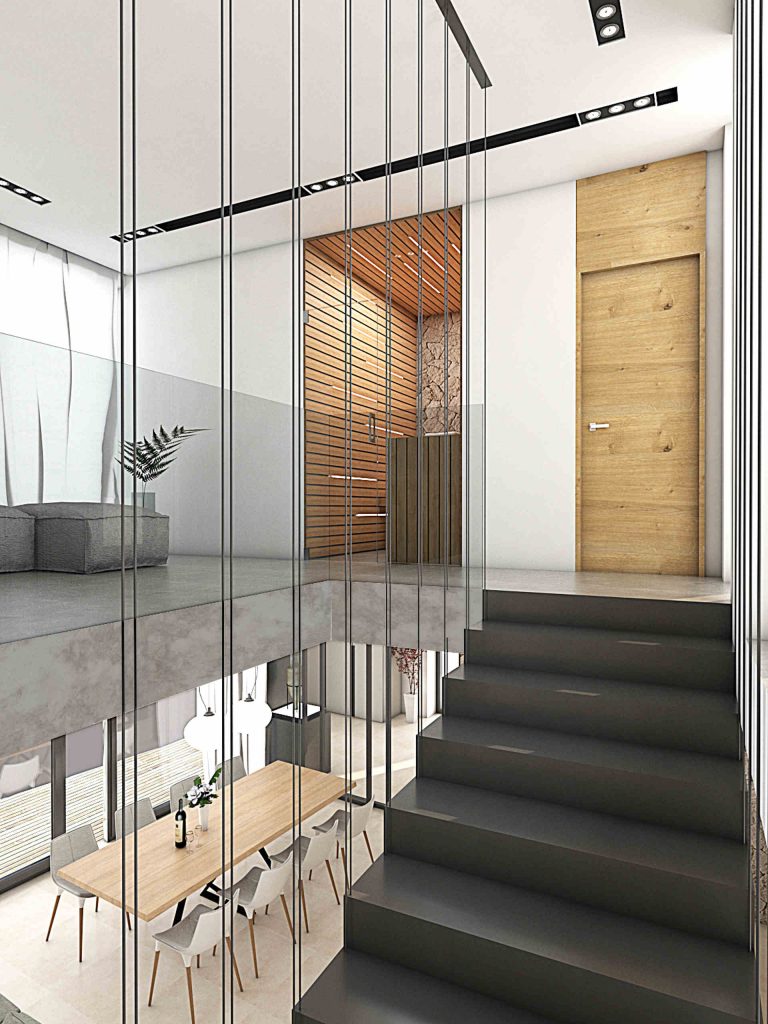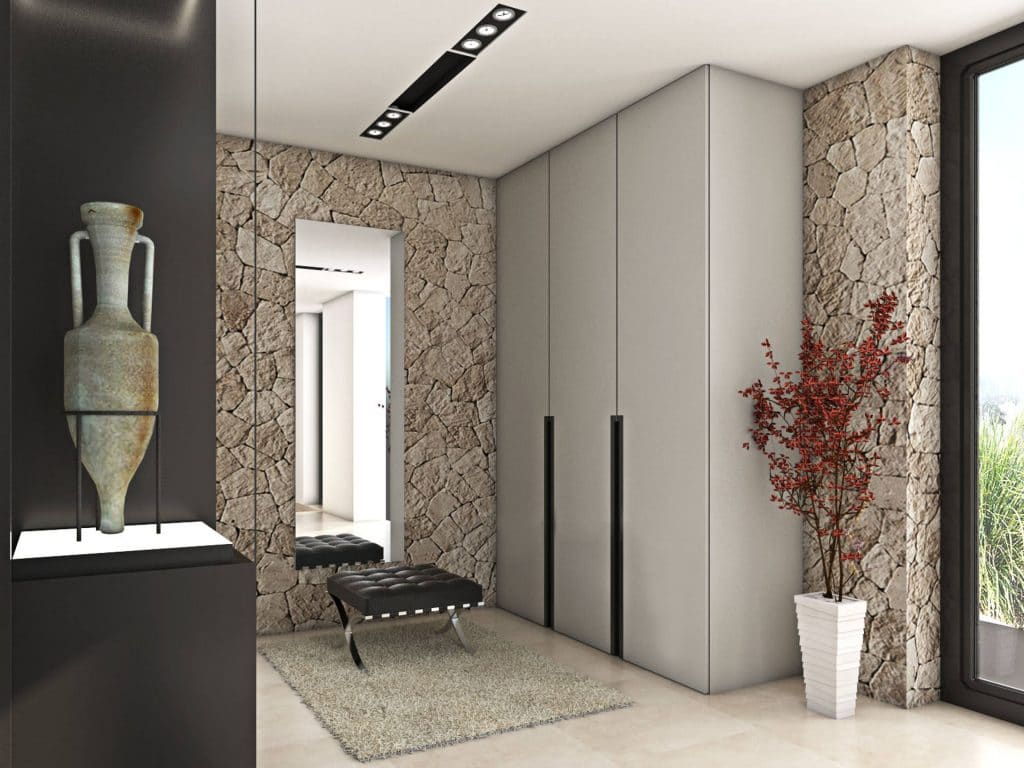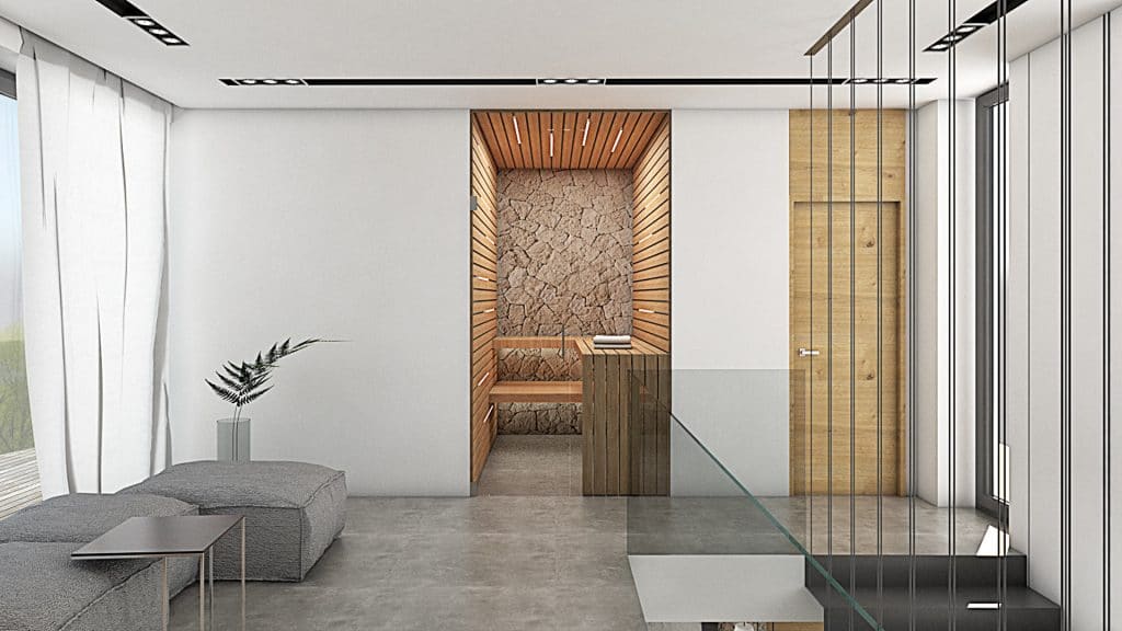 Der zweite Flügel zeichnet sich durch einen langen Flur aus, der 3 Schlafzimmer mit der Wohnzone verbindet. Um einen durchdringenden Blick auf das Meer und auf den nördlichen Teil des Grundstücks zu ermöglichen, sind die Fenster und Türen eingerissen. Mit anderen Worten, wenn Sie von der nördlichen Außenterrasse in den Flur schauen und die Schlafzimmertüren offen sind, sehen Sie das Meer. Neben den bereits erwähnten langgestreckten Fassadenöffnungen gibt es auch Innentüren. Sie sind in Holzdekor, schwarzer Linienbeleuchtung, Beton Imitation – Fliesen und Materialien wie Holz und Stein konzipiert.