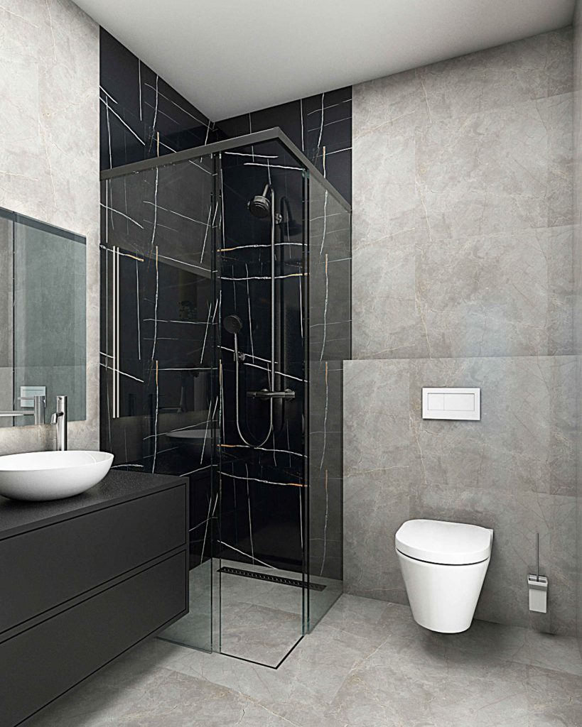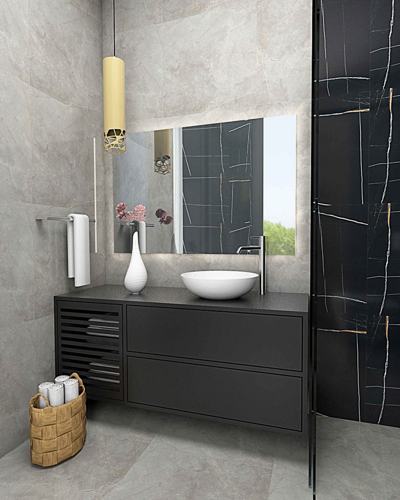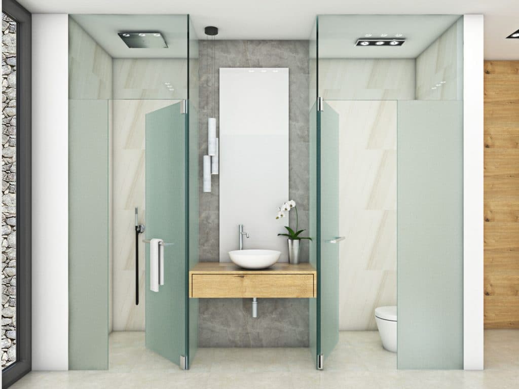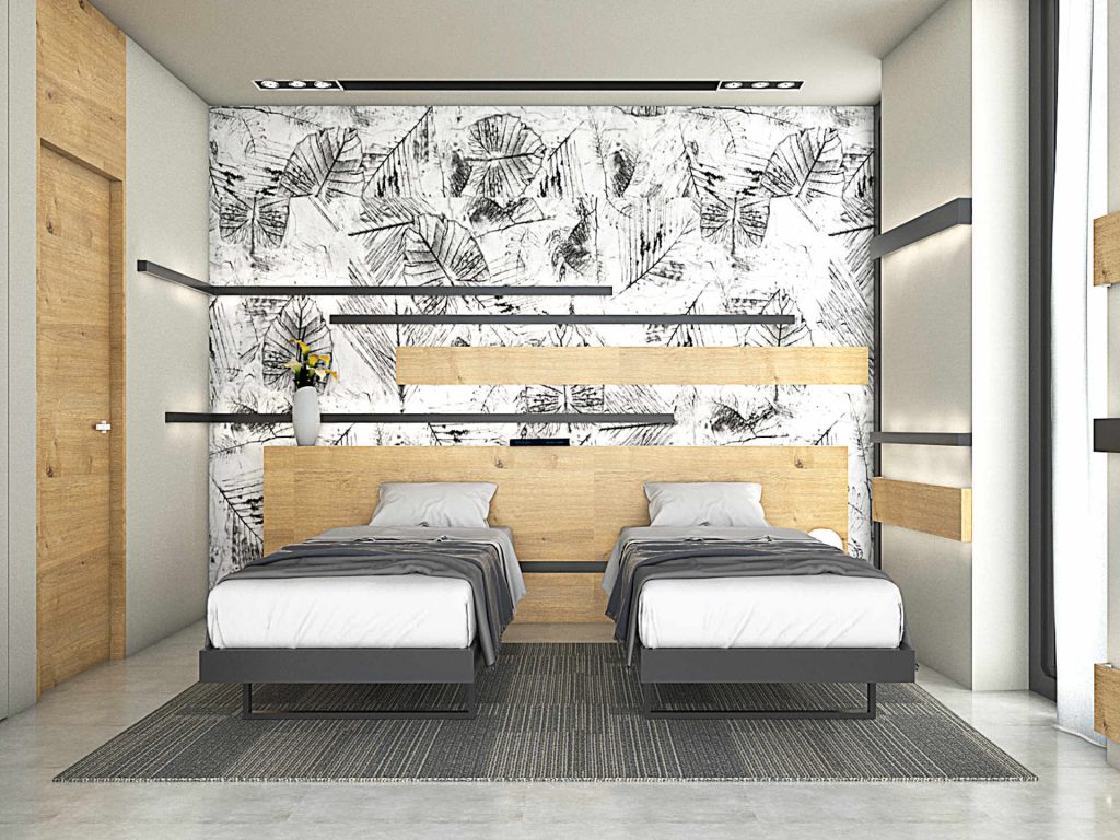 Der zweite Flügel zeichnet sich durch einen langen Flur aus, der 3 Schlafzimmer mit der Wohnzone verbindet. Um einen durchdringenden Blick auf das Meer und auf den nördlichen Teil des Grundstücks zu ermöglichen, sind die Fenster und Türen eingerissen. Mit anderen Worten, wenn Sie von der nördlichen Außenterrasse in den Flur schauen und die Schlafzimmertüren offen sind, sehen Sie das Meer. Neben den bereits erwähnten langgestreckten Fassadenöffnungen gibt es auch Innentüren. Sie sind in Holzdekor, schwarzer Linienbeleuchtung, Beton Imitation – Fliesen und Materialien wie Holz und Stein konzipiert.