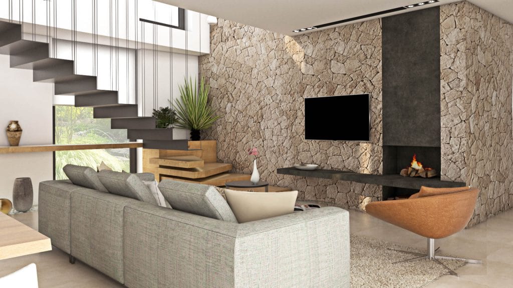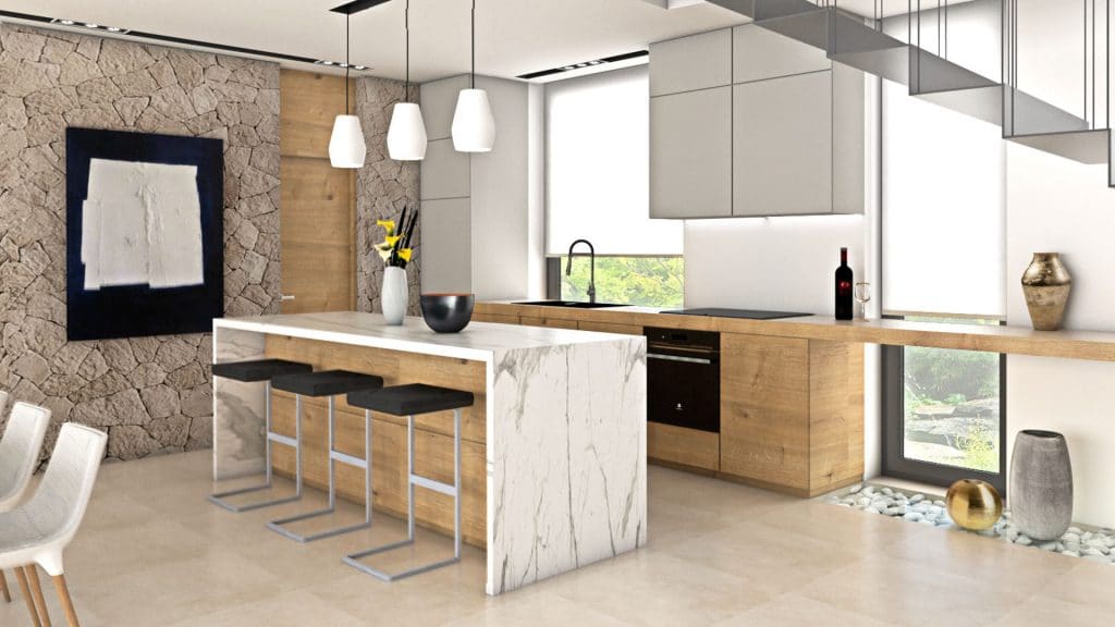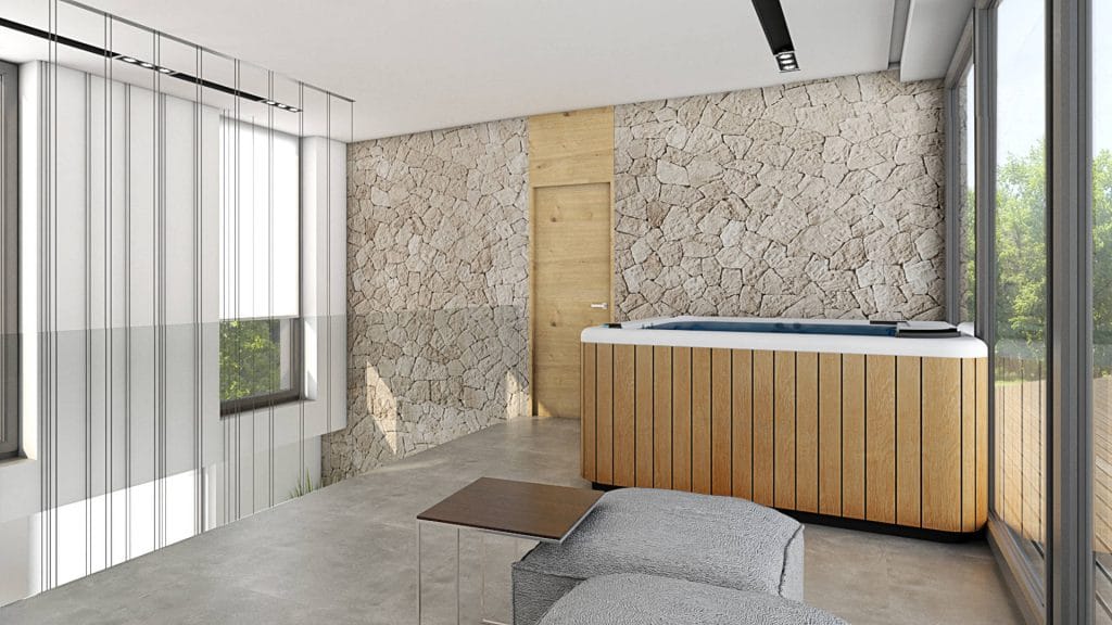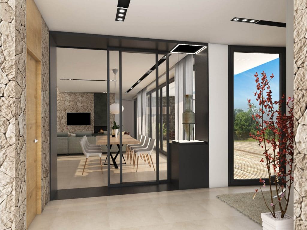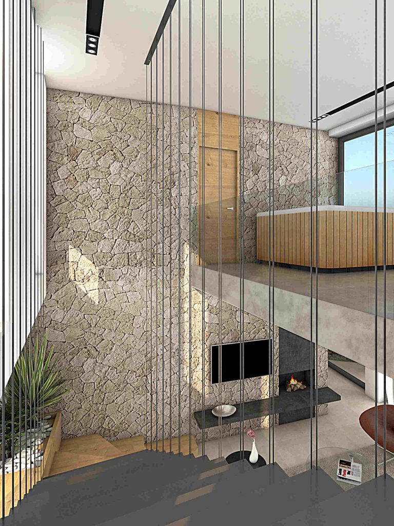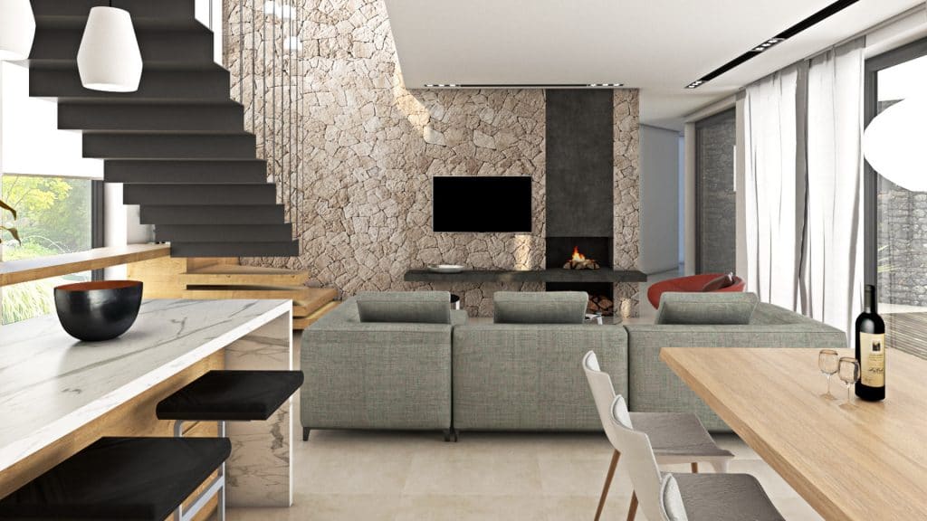 Fast 400 Quadratmeter beherbergten alle Funktionen und Zonen, die für einen qualitativ hochwertigen und unvergesslichen Urlaub benötigt werden. Geräumiger, verglaster Eingang, luftiges, offenes Wohnzimmer, bis zu 5 Schlafzimmer und begehbarer Kleiderschrank. Dann ein Loungebereich, ein Spielzimmer, ein Fitnessraum, eine Spa – und Wellnessoase, eine überdachte Ess- und sonnige, begrünte Dachterrasse sowie Innen- und Außenpools. Wir werden unsere Innentour in zwei Etappen unterteilen, unterirdisch-unterirdisch und erste Etage mit Terrasse, mit denen wir uns nächsten Donnerstag befassen werden. Die heutige „Tour“ beginnt im ersten Flügel des Erdgeschosses, d. h. in der täglichen Eingangszone, wo die Textur von Trockenhoden an der Küche und den Wänden des Wohnzimmers zu finden ist.