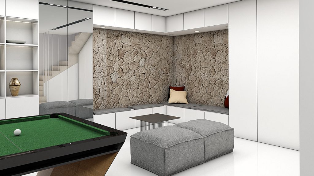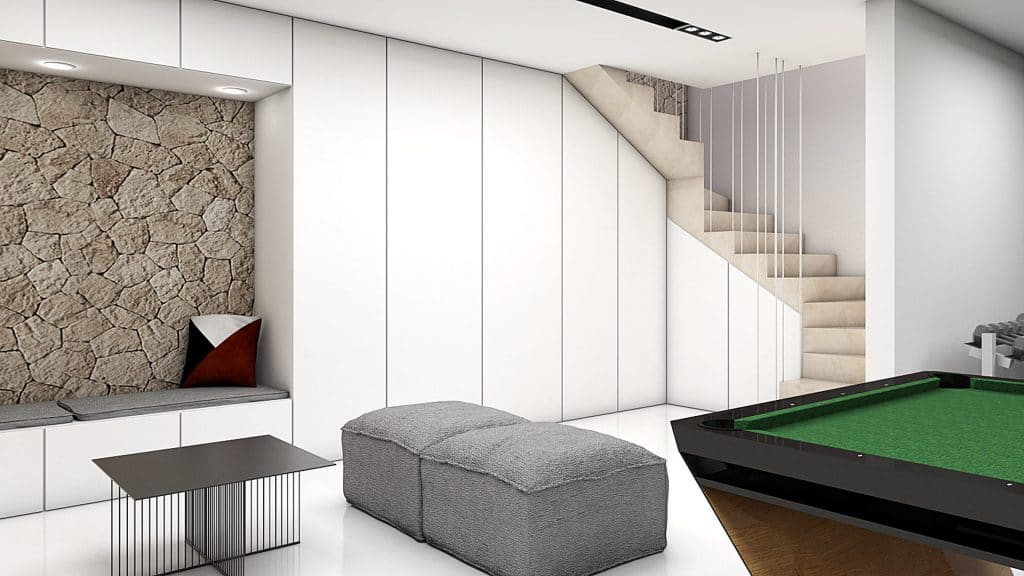 Unsere primäre Absicht war es, das anspruchsvolle Baugrundstück optimal zu nutzen und die schöne Aussicht auf Kvarner mit dem gesamten Volumen des Hauses zu genießen. Das Haus ist länglich, leicht gebrochen im Erdgeschoss. So wollten wir so viel Privatsphäre wie möglich für die Tageszone erreichen und den Blick auf das Meer in jeder Ecke und an jedem Fenster des Hauses pflegen. Der Boden wurde schräg im Verhältnis zum Erdgeschoss verlegt und mit einer langen Glaswand den Blick auf die Inseln Krk und Cres gerichtet. Mit der Verwendung von Fassadenstil – Trockenbau in Kombination mit Eiweißen Volumen sind eines der primären und dominierenden Elemente der Fassade Reihen von länglichen Öffnungen, die sich bis zur vollen Höhe des Bodens erstrecken und zusätzlich durch elegante Metallrahmen in Anthrazitfarben betont werden.