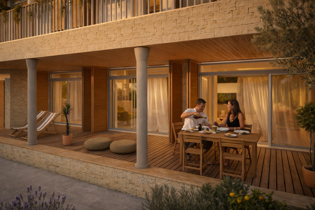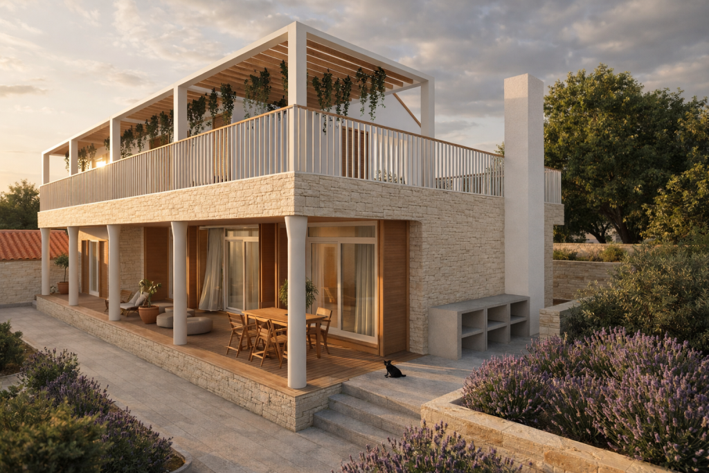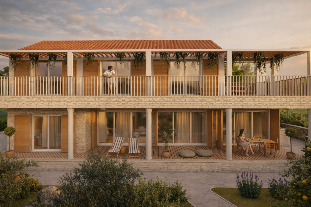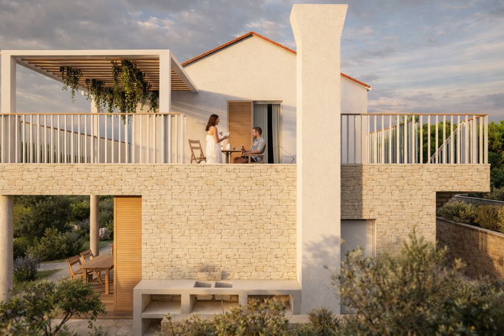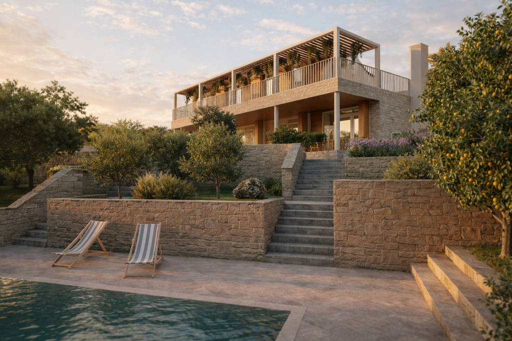 Die Materialität des Projekts orientiert sich am lokalen Kontext: Stein als primärer Träger der Volumen, Holz als Element von Wärme und Haptik sowie helle Putzflächen, die das mediterrane Licht reflektieren. Durch die Kombination dieser Elemente entsteht ein Gleichgewicht zwischen zeitgenössischem Ausdruck und kontextueller Einbindung.