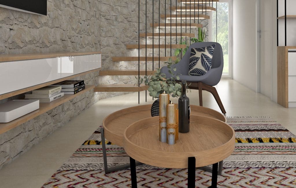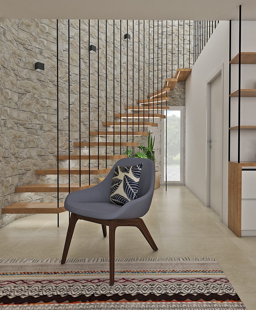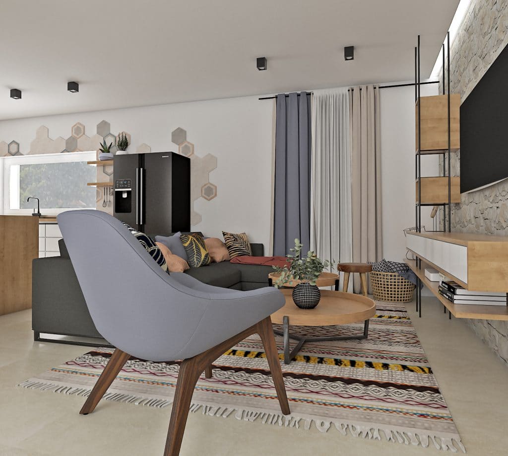Poštujući želje investitora, osmislili smo interijer čija je glavna tema kombinacija tradicije, modernog i morskog života. Odlučili smo se za tradicionalne i dosta logične materijale – kamen i drvo – te ih jasno naglasili kroz sam dizajn. Tako je kamen postao središnji dio „glavnih“ zidova u svim prostorijama. Drvo hrasta koristili smo kroz moderne, čiste i jednostavne linije kuhinjskih ploha i elegantnog konzolnog stepeništa.