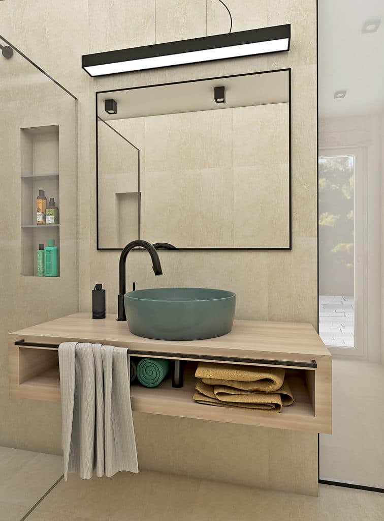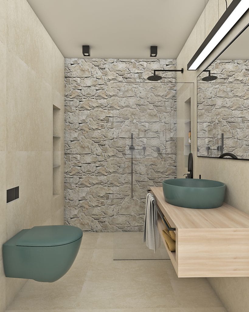 Plavom i bež bojom zavjesa reinterpretirali smo igru morskih valova i pijeska. Maslinasti elementi u prostoru, poput modernih sanitarija, podsjećaju na neobrane masline, a zidne obloge pričaju svaka svoju morsku „štoriju“. Podne keramičke pločice podsjećaju na zlatne pješčane obale, zidne kuhinjske su moderna verzija kamenog zida i oblutaka, dok su svi detalji u ulozi primorske vegetacije. Važan element u uređenju odigrala je i rasvjeta, koju smo naglasili crnom bojom . S druge strane, sakrivanjem LED traka, stvorili smo intimnani romantičan ambijent, spreman za tople, ljetne večeri uz čašicu, dvije dobrog dalmatinskog vina.