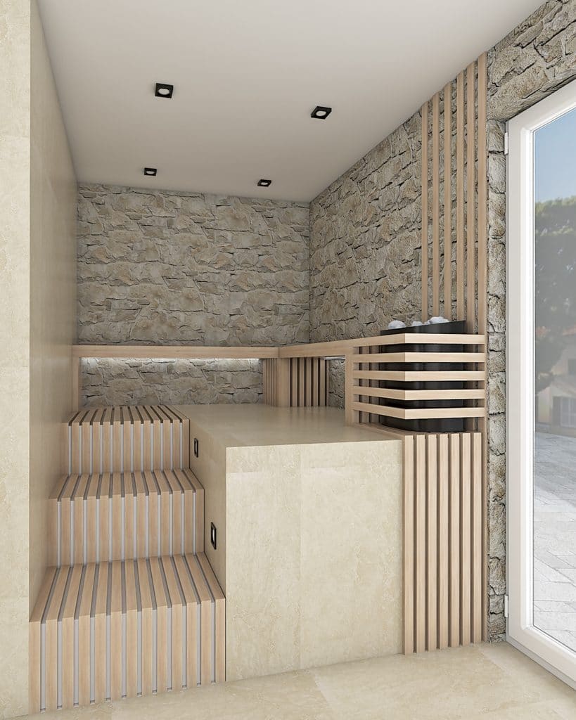 Sve smo začinili, osim mediternaskim mirisnim biljem, crnim i metalnim elementima – modernom ogradom, šipkama u prostoru i rasvjetom. Kupaonica i sauna dijele zajednički otvor, odnosno izlaz na terasu sa bazenom i jacuzzijem. Zbog toga smo koristili smo staklene klizne stijene, kako bi danje svjetlo prodrlo i u najprivatnije kutke doma.